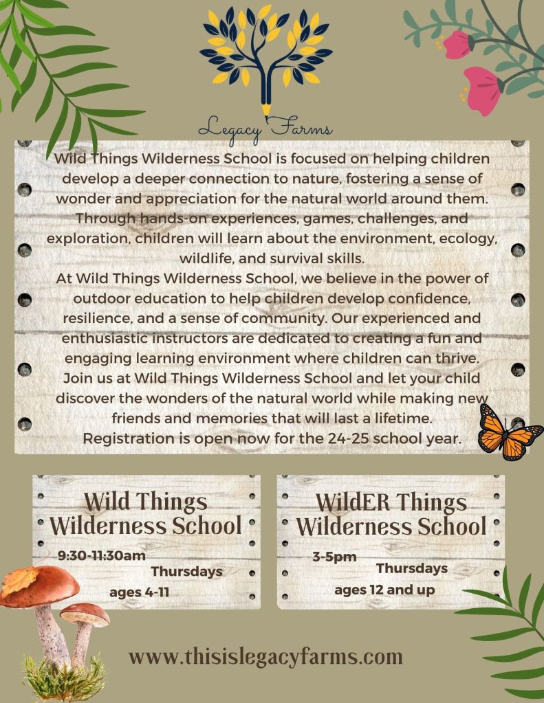 Wilderness School for the 2024-2025 school year begins September 12th, the cost is $125 per month September-May. A $200 nonrefundable deposit is due upon registration. This deposit includes your child’s farm shirt, farm bag, nature journal, and other supplies.